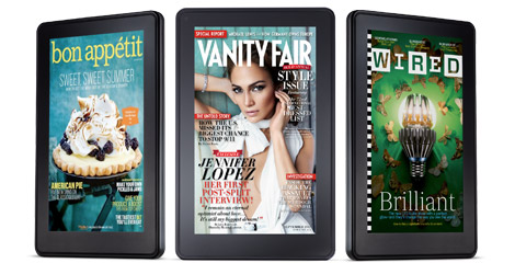 Enjoy your favorite magazines with glossy, full-color layouts, photographs and illustrations. Choose from hundreds of titles, such as Bon Appetit, Elle, and Oprah. Special editions of titles likeVanity Fair, Wired, and GQ come with built-in video, audio and other interactive features.